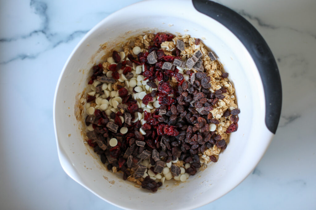 As evenly as you can, sprinkle the cranberries, both kinds of chocolate chips, and raisins over the mixture. Beat on low speed until just combined.