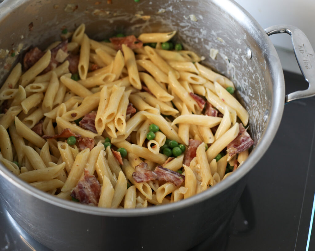 Remove the sprig of thyme and add the peas along with a pinch of salt and toss until heated through. Add the cooked pasta, the 1/2 cup of reserved pasta cooking liquid, bacon, heavy cream, Parmesan, 1 teaspoon salt and 15 grinds fresh black pepper. Stir until evenly combined.