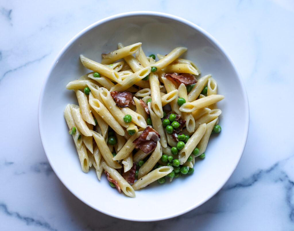 Pasta with Shallots, Peas and Bacon