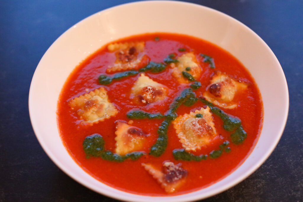 Tomato Soup with Ravioli Croutons and Basil Pesto